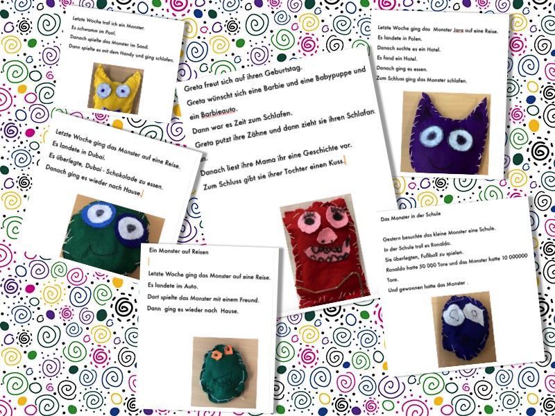 Wir sind die Klasse 4. Wir haben im Kunstunterricht kleine Monster genäht. Anschließend durften wir uns kleine Geschichten zu unseren Monstern überlegen.